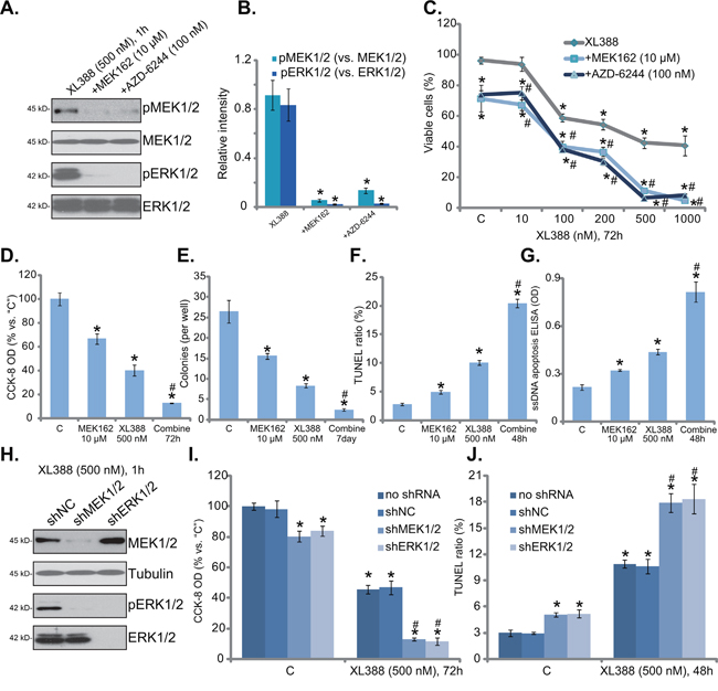 Figure 5: MEK-ERK inhibition potentiates XL388-induced cytotoxicity against RCC cells. 786-0 cells were treated with applied concentration of XL388, or plus indicated MEK-ERK inhibitor, cells were further cultured in the conditional medium for designated time, expression of the labeled proteins was tested by Western blot assay A., blot results of three repeats were quantified in B. Cell death C and D. and proliferation E. were tested by the listed assays; Cell apoptosis was examined by the TUNEL staining assay F. and ssDNA apoptosis ELISA assay G. Stable 786-0 cells, expressing MEK1/2 shRNA (“shMEK1/2”), ERK1/2 shRNA (“shERK1/2”) or nonsense control shRNA (“shNC”), were treated with XL388 (500 nM), expression of listed proteins was shown H. Cell viability I. and apoptosis J. were also tested. For each assay, n=5. Experiments in this figure were repeated three times, and similar results were obtained. *p< 0.05 vs. “C” group. #p < 0.05 vs. “XL388” only group (C-G). #p < 0.05 vs. “shNC” group (I and J).