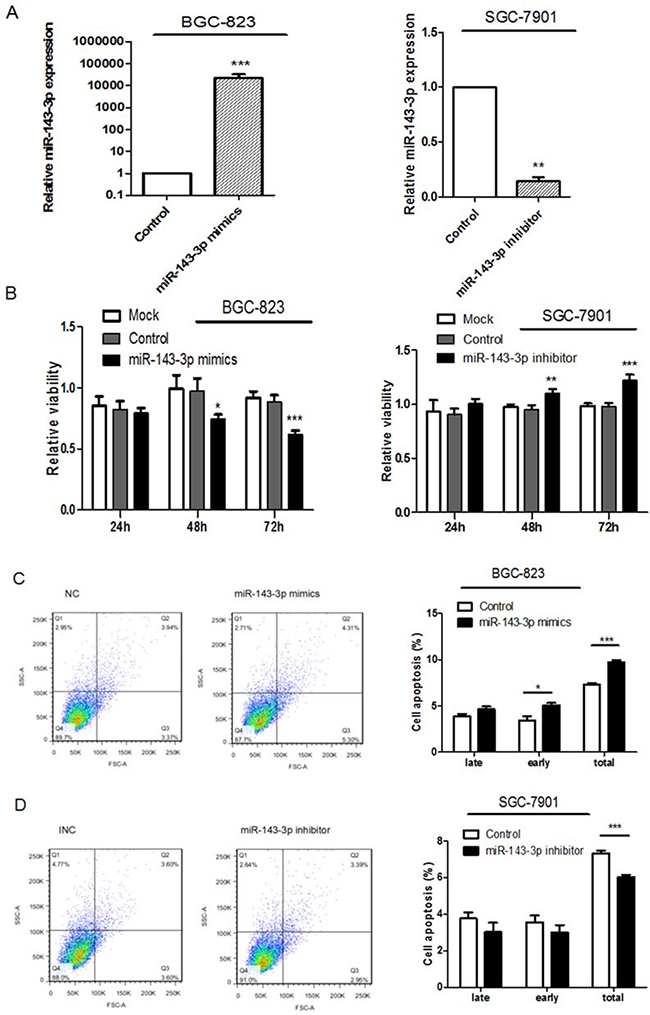 Figure 3: Ectopic expression of miR-143-3p in gastric cancer cells suppresses cell proliferation, induces apoptosis and inhibites cell migration and invasion. A. MiR-143-3p expression was significantly increased by transfecting miR-143-3p mimics into BGC-823 cells and reduced by transfecting miR-143-3p inhibitor into SGC-7901 cells. As compared with their respective negative controls 48 hours after transfection and normalized to U6 snRNA. B. Cell viability of gastric cancer cells was examined with CCK-8 assays. Quantified relative proliferation rates are presented as a histogram in the lower panel. C-D. Effect of miR-143-3p on apoptosis of gastric cancer cells was examined with flow cytometry analysis. Figure is representative of 3 experiments with similar results. Late apoptosis rate, early apoptosis rate and total apoptosis rate are presented as a histogram in the lower panel. E-F. The transwell assay was performed to analyze the effect of miR-143-3p on the migration and invasion of BGC-823 and SGC-7901 cells. Magnification, ×200. Scale bar represents 100μm. Quantified results are presented as a histogram in the lower panel. Data represent the means±SD from 3 independent experiments. *P < 0.05, ** P<0.01, *** P<0.001.