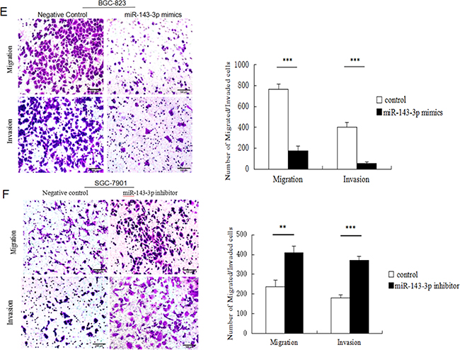 We next examined whether miR-143-3p could affect gastric cancer cell migration and invasion by Transwell assays. The results showed that miR-143-3p re-expression distinctly abrogated the migration and invasion of BGC-823 cells (Figure 3E). Correspondingly, silencing of miR-143-3p in SGC-7901 cells promoted migration and invasion (Figure 3F).