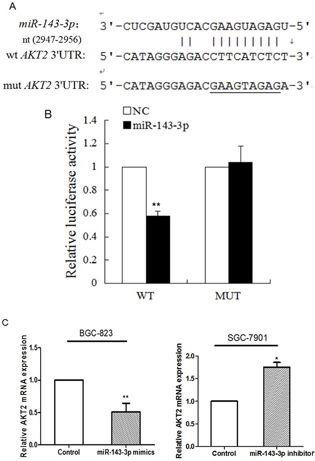 Figure 4: AKT2 is a direct target of miR-143-3p in gastric cancer. A. Schematic of the construction of wild-type or mutant pGL3-AKT2 3’UTR vectors is indicated. B. Relative luciferase activities were analysed in HEK293T cells. Renilla luciferase vector was used as an internal control. C. The effect of miR-143-3p on the expression of AKT2 mRNA by qRT-PCR. β-actin served as an internal control. Data represent the mean±SD from 3 independent experiments. D. Related expression of AKT2 protein in cells treated with miR-143-3p mimics or its inhibitor was determined by western blot.. All *P<0.05, **P<0.01.
