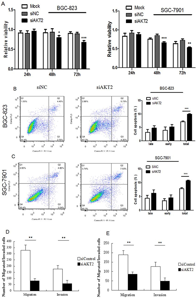 Figure 5: Fuctional effects of AKT2 siRNA on gastric cancer cell proliferation, apoptosis, migration and invasion. A. Suppression of AKT2 significantly inhibited gasric cancer cell proliferation. B-C. Suppression of AKT2 significantly induced cell apoptosis. D-E. Suppression of AKT2 significantly inhibited the migration and invasion of BGC-823 and SGC-7901 cells. Data represent the means ± SD. *P < 0.05, ** P<0.01, *** P<0.001.