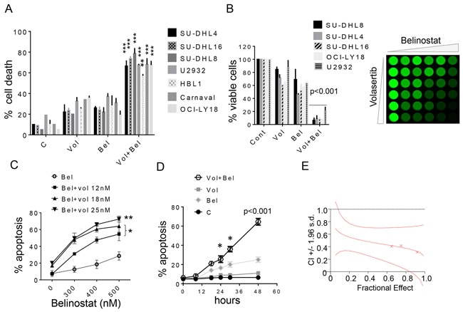 Figure 1: Belinostat dramatically increases volasertib lethality and inhibits cell growth in DLBCL cells. A. Various NHL cell lines SU-DHL16, SU-DHL4, SU-DHL8 (GC subtype), HBL-1, U2932 (ABC-subtype), OCI-LY18, Carnaval (double hit) were exposed to volasertib (5-30 nmol/L) and belinostat (100-400 nmol/L) alone or together for 48 hr, after which cell death was assessed by 7-AAD. **p < 0.01 and ***p < 0.001, significantly greater than values for single agent treatment. For these and subsequent studies, values represent the means ± S.D. for experiments performed in triplicate on at least 3 separate occasions. B. Cells were exposed to volasertib and belinostat as described above alone or together for 48 hr, after which cells were enumerated by hemocytometer (left panel, p < 0.001, significantly greater than values for single agent treatment). SU-DHL8 were exposed to increasing concentrations of volasertib and belinostat, after which cell growth and viability were evaluated using the CellTiter-Glo Luminescent assay (right panel). C. SU-DHL4 cells were exposed to the indicated concentration of volasertib in the presence or absence of belinostat for 48 hr, after which cell death was assessed by 7-AAD. *p < 0.05, **p < 0.01, significantly greater than values for single agent treatment. D. SU-DHL4 cells were treated with volasertib (25 nmol/L) or belinostat (400 nmol/L) individually or in combination for the indicated intervals, after which the extent of cell death was determined by 7-AAD uptake and flow cytometry. *p < 0.05, ***p < 0.001, significantly greater than values for single agent treatment. E. SU-DHL4 cells were treated with a range of volasertib and belinostat concentrations administered at a fixed ratio. At the end of 48 hr, the percentage of cell death was determined by monitoring 7AAD+ cells. CI values were determined in relation to the fractional effect by using Calcusyn software. CI values less than 1.0 correspond to synergistic interactions.