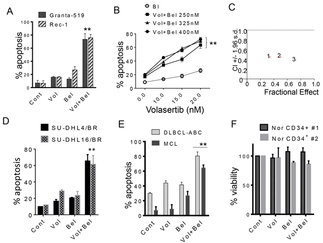 Figure 2: Co-treatment with volasertib and belinostat synergistically induces cell death in mantle cell lymphoma, bortezomib-resistant DLBCL cells, and primary patient specimens, but not normal CD34+ bone marrow cells. A. Granta-519 and Rec-1 (MCL) cells were exposed to volasertib (20-30 nmol/L) and belinostat (200-300 nmol/L) alone or in combination for 48 hr, after which cell death was assessed by 7-AAD. **p < 0.01, significantly greater than values for single agent treatment. B. Granta-519 cells were exposed to the indicated concentration of volasertib in the presence or absence of belinostat for 48 hours after which cell death was assessed by 7-AAD. **p < 0.01, significantly greater than values for single agent treatment. C. Granta-519 cells were treated with a range of volasertib and belinostat concentrations. At the end of this period, the percentage of 7AAD+ cells was determined by flow cytometry. CI values less than 1.0 reflect synergistic interactions. D. SU-DHL4/BR and SU-DHL16/BR cells were exposed to volasertib (5-30 nmol/L) and belinostat (100-400 nmol/L) alone or together for 48 hr, after which cell death was assessed by 7-AAD. E. Mononuclear peripheral blood cells from a MCL patient in leukemic phase and BM cells from a DLBCL patient with bone marrow infiltration (> 65% lymphoma cells in each case) were exposed to volasertib (15 nmol/L) or belinostat (200-300 nmol/L) individually in combination for 48 hours, after which the percentage of apoptotic cells was determined by annexin V/PI (**p < 0.01, significantly greater than values for single-agent treatment). F. Mononuclear cord blood cells (two separate experiments) were isolated and exposed to volasertib (25 nmol/L) or belinostat 250 nmol/L individually or in combination for 48 hours, after which viable (non-apoptotic) CD34+ cells was determined by annexin V/PI positivity. P values for the combination were > 0.05, not significantly different compared to values for either agent alone.
