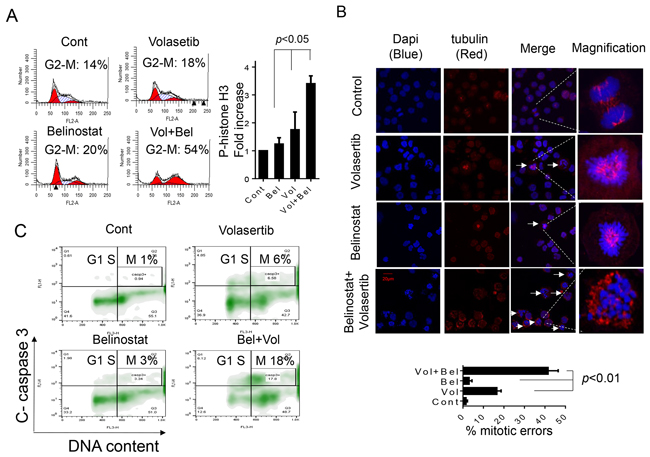 Combined volasertib/belinostat exposure results in pronounced mitotic arrest, increased phospho-histone H3 accumulation, a marked increase in mitotic errors, and mitotic cell death