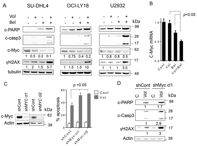 Figure 4: Co-exposure of DLBCL to volasertib and belinostat leads to induction DNA damage, downregulates c-Myc and knocking down of c-Myc potentiates the lethality of volasertib. A. SU-DHL4, OCI-Ly18 and U2932 cells were treated with volasertib (10-25nM) alone or with belinostat (200-400 nmol/L) for 24 hr after which cells were lysed and proteins extracted. Expression of the indicated proteins was determined by Western blotting using the indicated antibodies. Each lane was loaded with 25 μg of protein; blots were stripped and re-probed with tubulin to ensure equivalent loading and transfer. Results are representative of three replicate experiments. Numbers under the blots correspond to densitometric values normalized to controls arbitrarily set to 1.0. B. SU-DHL4 cells were exposed to volasertib (25 nmol/L) ± belinostat (400 nmol/L) for 24 hr after which mRNA of c-Myc was extracted and quantified as described in methods. (p < 0.05, significantly less than values for single-agent treatment). C. c-Myc shRNA (shc-Myc clone1 and clone2) and scrambled-sequence control shRNA (shCont) SU-DHL4 cells were generated and the cells were treated with volasertib (25 nmol/L) for 48 hr, after which the percentage of dead cells was determined by 7-AAD (right panel), (p < 0.05 versus control). D. shc-Myc and shCont SU-DHL4 cells were treated with volasertib for 24 hr, after which Western blot analysis was performed to monitor c-PARP, cleaved caspase-3, and γH2A.X expression.