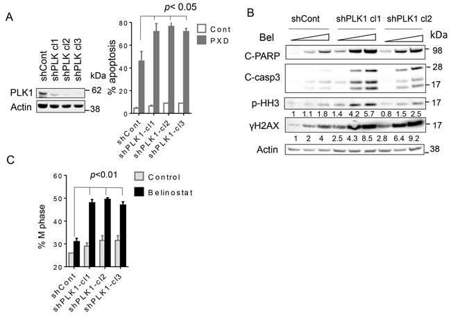 Figure 5: Knockdown of PLK1 strikingly potentiates belinostat-mediated apoptosis in SU-DHL4 cells. A. SU-DHL4 cells were transfected with shPLK1 or scrambled sequence shRNA (shControl). Three knockdown PLK1 clones were selected (shPLK1 clones1-3) (left panel), the cells exposed to 450 nmol/L of belinostat for 48 hr, after which cell death was monitored by 7-AAD staining (right panel). B. shPLK1 and shCont cells were treated with 300 and 450 nmol/L of belinostat for 24 hr, after which Western blot analysis was performed to monitor c-PARP, cleaved caspase-3, p-Histone H3 and γH2A.X expression. Numbers under the blots correspond to densitometric values normalized to actin arbitrarily set to 1.0. C. shPLK1 and shCont cells were treated with 450 nmol/L of belinostat for 40 hr after which cell cycle analysis was performed by flow cytometry and the percentage of M cells was determined (p < 0.01 for knock-down cells versus controls).