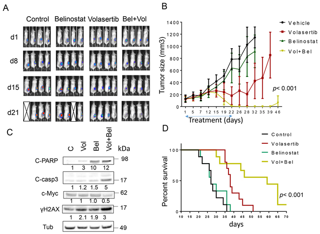To evaluate the in vivo implications of these findings, flank and systemic DLBCL xenograft models were employed. For the former, 10 x 106 luciferase-labeled U2932 ABC-DLBCL cells were inoculated in the flanks of NOD/SCID-γ mice, and after 10 days, animals were randomly divided into 4 groups. They were then treated with belinostat (80 mg/kg ip 5 d/wk) ± volasertib (12 mg/kg ip weekly) after which tumor growth was monitored by luciferase imaging as well as caliper-based tumor size measurements. As shown in Figure 6A, imaging of mice after luciferin injection revealed that control and belinostat-treated animals exhibited robust tumor growth after 21 days with several animals dying. Volasertib treatment alone modestly reduced tumor growth compared to control and belinostat-treated animals. However, combined treatment sharply reduced tumor growth, reflected by marked attenuation of luciferase signal over this interval. Consistent results were obtained when tumor size was monitored (Figure 6B). Whereas belinostat alone had little effect on tumor growth, volasertib slightly reduced mean tumor size after 2-3 weeks of treatment. However, combined treatment dramatically reduced tumor growth to nearly undetectable levels after 22 days of treatment (p< 0.001; one-way Anova). Toxicity for the combination, reflected by behavioral changes, fur loss, or loss of body weight (Supplementary Figure 8) was minimal. In companion experiments, Western blot analysis of excised tumor tissue revealed more pronounced cleavage of caspase-3 and PARP, c-Myc down-regulation, and γH2A.X formation in tumors obtained from mice treated with both agents (Figure 6C). Finally, Kaplan-Meier analysis revealed a very significant improvement in survival for combined (56.2 ± 14.5 days) vs. volasertib (39.7 ± 5.1 days), belinosat (29.1 ± 6.3 days) alone or control (27.8 ± 5.1 days) treatment (p< 0.001).