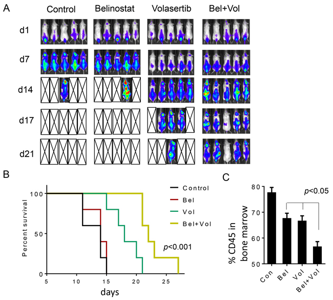 Parallel studies were performed using a systemic double-hit DLBCL model (OCI-Ly18). Five days after iv injection of cells, animals were randomly grouped and treated with volasertib ± belinostat as described above, after which tumors were imaged at the indicated intervals (Figure 7A). Belinostat alone failed to suppress tumor growth, and all animals from both vehicle and belinostat groups were dead after 17 days (average survival days for control: 13 ± 1.87, belinostat 13.8 ± 1.64). Volasertib alone modestly reduced tumor growth, but the majority of animals were dead by 21 days (average survival 18.4 ± 2.61 days). However, while the combination failed to eradicate systemic tumor in most animals, all animals were alive at this interval (average survival 22.8 ± 2.95 days; Figure 7B). Overall survival was significantly greater for combined treatment versus volasertib or belinostat treatment alone (p< 0.001). Finally, in a separate study, animals were sacrificed after 10 days of treatment, after which marrows were extracted and expression of the human marker CD45 monitored by flow cytometry. Combined treatment significantly reduced bone marrow CD45+ cells compared to single-agent treatment (Figure 7C; p< 0.05).