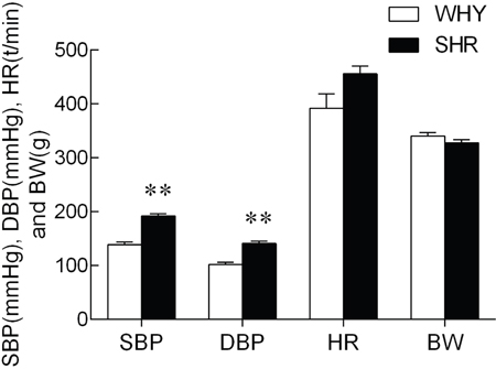 Systolic blood pressure, Diastolic blood pressure, Heart rate, and Body weight were shown in Figure 1. Compared with WKY, the systolic blood pressure (SBP) and diastolic blood pressure (SDP) of SHR were increased significantly. However, the resting heart rate and body weights did not differ between two groups.