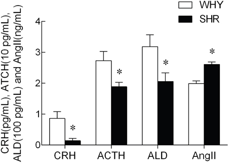 Figure 2: The content of CRH, ACTH, ALD and AngII in plasma from SHR compared with WKY.