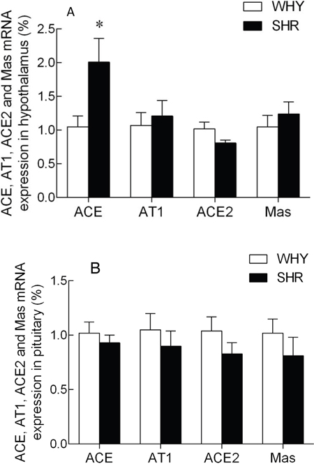 Our study demonstrated that ACE, AT1R, ACE2, MasR mRNA were expressed in the hypothalamus and pituitary of both, the WKY and SHR rats. The upregulation of ACE mRNA and the downregulation of ACE2 mRNA and protein in hypothalamus suggested that the balance between hypothalamic ACE2 and ACE determined blood pressure. The RAS in the nervous system is critical for regulating hypertension and cardiovascular diseases. The expression of ACE2 is suppressed in RVLM of SHR compared to WKY, whereas overexpression of ACE2 decreased the high blood pressure in SHR [30]. In addition, ACE2 overexpression in the PVN demonstrated beneficial effects against the Ang II-induced hypertensive response [10]. However, similar expression of ACE, AT1R, ACE2, MasR mRNA in the pituitary of both groups of mice indicated that the pituitary RAS was not involved in the hypertension demonstrated by SHR rats.