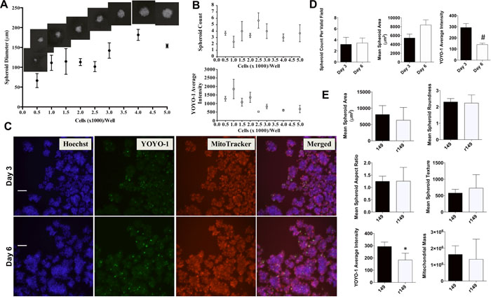 Figure 3: Assessment of SUM149-derived tumor spheroid morphology. A. SUM149 cells at different seeding densities and visualized on day 3 to assess 3D spheroid size, Representative spheroid images (10x) inset above Figure 3A to show the change in spheroid size for each seeding density. B. Spheroid viability as quantified by average YOYO-1 intensity (top) and count (bottom). Representative data shows mean ± SEM for each parameter [replicates = 3]. C. Representative pictures of individual channel signal and merged overlay showing SUM149 tumor spheroids at days 3 and 6 stained for nuclei (Hoechst), viability (YOYO-1) and mitochondrial membrane potential (MitoTracker Red). Cells fixed before imaging. 150-175 fields of view imaged for each well and 500 fields of view per dye for each well at 10x magnification (Scale bar = 100 microns). D. Quantitative analysis of SUM149 tumor spheroids at day 3 and day 6 for number of spheroids, area (μm2), viability measured by YOYO-1 average intensity. Bars represent mean ± SEM for each parameter [replicate fields/well = 5-18; #P<0.005 comparisons made between days 3 and 6]. E. Quantitative analysis of drug resistant rSUM149 cell line (r149)-derived tumor spheroids compared with SUM149 (149)-derived tumor spheroids at day 3 for indicated parameters on the Y axis in each graph, which includes area (μm2), roundness (shape P2A), aspect ratio (shape LWR), texture (Hoechst variable intensity), YOYO-1 average intensity, mitochondrial mass (total MitoTracker intensity), and mitochondrial brightness (average MitoTracker intensity). Bars represent mean ± SEM for each parameter [replicate fields of viable spheroids/well = 6; *P<0.05 comparisons made between SUM149 and rSUM149].