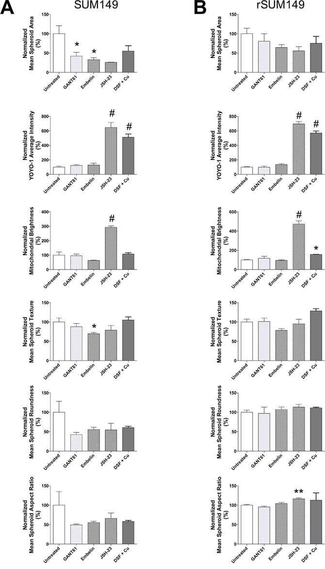 Figure 5: Quantitative analysis of XIAP and NFκB inhibitors on IBC tumor spheroid cell morphology, viability and mitochondrial function. A. SUM149 and B. rSUM149 tumor spheroids at day 3 after indicated treatments. Bars represent mean ± SEM for each parameter [replicate fields of viable spheroids/well = 2-11; *P<0.05, **P<0.01, #P<0.005 comparisons made between each treatment and untreated].