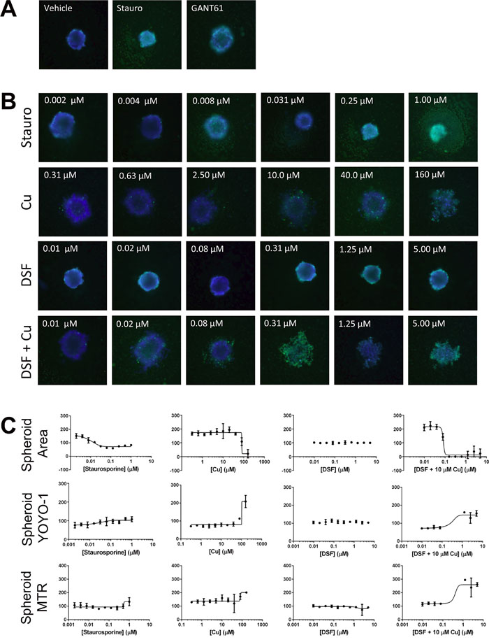 Figure 6: DSF in combination with copper inhibits SUM149-derived spheroids grown in a high-throughput assay format. SUM149 cells plated at 400 cells/well in a 384-well ultra low attachment plate treated with indicated compounds and includes a 10-pt dose response, 1:2 dilutions of Staurosporine (0.002 μM – 1 μM); CuSO4 (0.3 μM – 160 μM), DSF alone (0.01 μM – 5 μM); and combination of DSF (0.01 μM – 5 μM) + 10 μM CuSO4 (DSF+Cu) and single concentration of GANT 61 (10 μM). Representative images A., B. of Hoechst and YOYO-1 channels merged for a combined assessment of spheroid area, integrity and growth inhibition are shown along with C. graphical presentation of the quantitative multiparametric analysis.