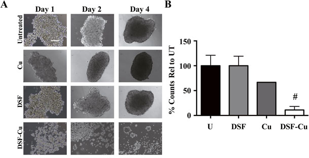 Figure 8: DSF-Cu disrupts formation of IBC tumor emboli under in vitro simulated growth conditions. A. Representative images (10 x – scale bar = 200 microns) of SUM149 cells grown under tumor emboli conditions for 1-4 days and treated with 10 μM copper (Cu), 100 nM disulfiram (DSF) or DSF-Cu. B. Percent of spheroid number relative to untreated for SUM149 cells grown for 4-5 days [#P<0.005 comparisons made between treatment and untreated].