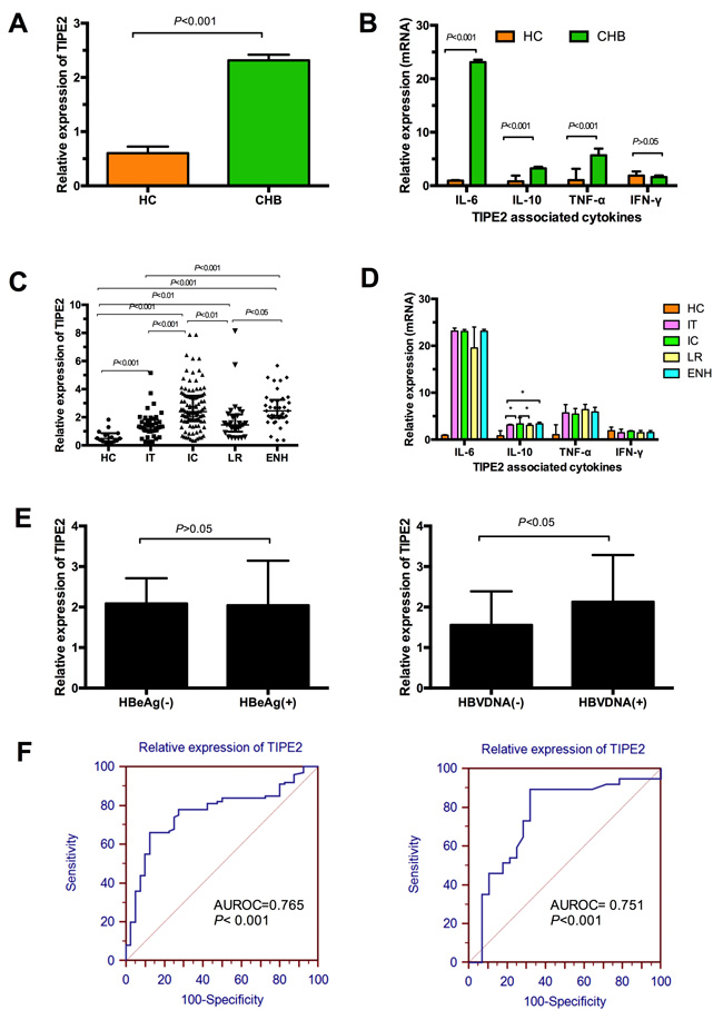 In summary, TIPE2 might be associated with immune clearance of patients with chronic hepatitis B. Furthermore, the optional cut off values of 2.02 and 1.59 for TIPE2 mRNA as biomarker have strong power in identifying CHB patients with IC and ENH phases from patients with IT and LR phases.