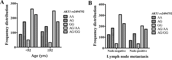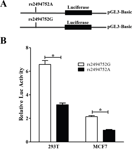 Figure 3: Effect of the rs2494752 polymorphism on the AKT1 promoter activity. Schematic representation of reporter plasmids containing the AKT1 rs2494752 A or G allele A., and the two constructs were transiently transfected into the 293T and MCF7 cells B. Data were measured as mean ± standard deviation (SD) from 3 separate experiments that were each performed in triplicate (*P<0.05).