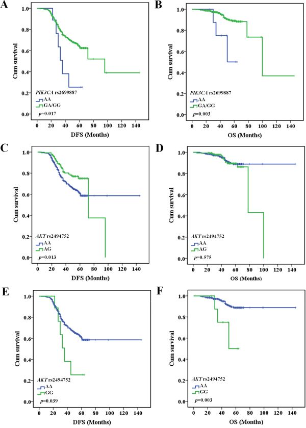Figure 2: The relationship between the AKT1 rs2494752 polymorphism and BC prognosis according to Kaplan-Meier analysis. PIK3CA rs2699887 GA/GG genotype had longer DFS A. and OS B. in BC patients with CE(A)F regimen chemotherapy. AKT1 rs2494752 AG genotype had shorter DFS C., but no correlation with OS D. in BC patients after CE(A)F regimen chemotherapy. AKT1 rs2494752 GG genotype had shorter DFS E. and OS F. in BC patients after CE(A)F regimen chemotherapy.