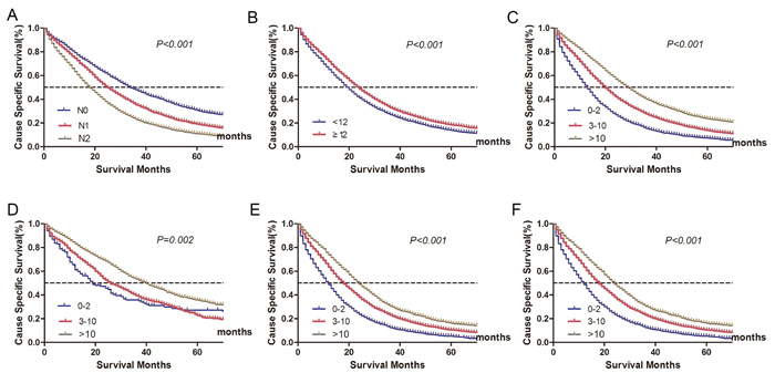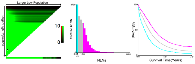 The median number of NLNs for patients included in SEER database was 9 (IQR, 4-15). X-tile plots were constructed and the maximum of χ2 log-rank value of 1209.449 was produced applying the number 2 and 10 as cutoff values to divide the cohort into high, middle, and low subsets in terms of CSS (Figure 1).
