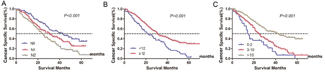 Figure 3: Survival curves of metastatic colorectal cancer treated with palliative surgery in Fudan University Shanghai Cancer Center according to different lymph node status. A. N stage: 5-year CSS were 34.3%, 24.3%, 7.6% in N0, N1 and N2 stage, respectively (χ2 = 17.492, P < 0.001). B. Lymph node count: 5-year CSS were 2.9%, and 29.4% in patients with < 12 or ≥12 lymph node retrieval (χ2 = 15.047, P < 0.001). C. Negative lymph node count: 5-year CSS were 0, 6.6%, 39.1% in patients with 0-2, 3-10 and ≥11 negative lymph node count, respectively (χ2 = 39.215, P < 0.001).
