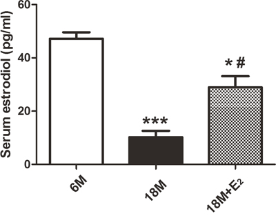 Figure 1: Estradiol concentration in mice serum. The concentration of serum estradiol (pg/ml) was decreased in 18 M group in comparison with 6 M group (n = 8) (* p < 0.05, *** p < 0.001). Estradiol administration in 18 M + E2 group partly reversed the low level of estradiol in 18 M mice (n = 8) (# p < 0.05, unpaired t-test). Data are presented as mean ± SEM.