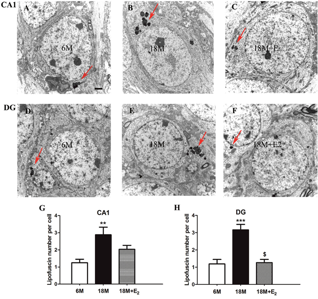 Figure 3: Lipofuscin deposition in the hippocampal neuron of mice. A. Single lipofuscin presented in the CA1 subfield of 6 M group. B. A pile of lipofuscins were accumulated in the perinuclear region of CA1 neurons in 18 M group. C. The amount of lipofuscins in the CA1 neuron of 18 M + E2 group was limited. D. Only small amount of lipofuscins could be seen in the DG subfield of 6 M group. E. Great amount of lipofuscins was found in the DG neuron of 18 M group. F. It is hard to trace lipofuscin in the DG neuron of 18 M + E2 group. G. The number of deposited lipofuscins was remarkably increased in the CA1 region of 18 M group. H. Estrogen replacement in 18 M + E2 group can mitigate the deposition of lipofuscin in the DG region of 18 M group. Lipofuscin is composed by a group of spherical structures with varying degrees of electron density which is pointed by rigid arrow in each image. Scale bar = 2 μm. ** p < 0.01, *** p < 0.001 compared to 6 M group; $ p < 0.05 compared to 18 M group. Data are presented as mean ± SEM.