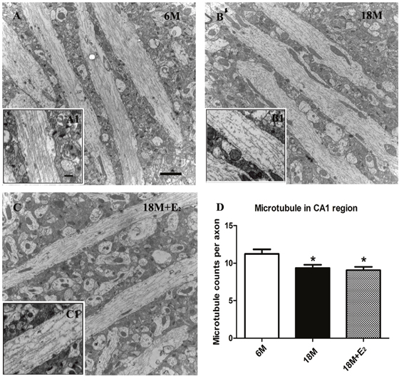 Figure 4: Estrogen was unable to ameliorate the destabilized microtubule in postmenopause mice. A. Regular and integrated microtubules were detected in CA1 region of 6 M group; A1. Well-organized fiber-like microtubules were visible in the enlarged region. B. The neurons of 18 M mice displayed inconsecutive microtubules; B1. Great intervals between microtubules in axon of neuron could be seen. C. Microtubules in 18 M + E2 mice also presented a less-organized morphology; C1. The continuity and amount of microtubules declined in neurons. D. Compared with 6 M group, the mean number of axonal microtubules in 18 M group was greatly decreased as well as in 18 M + E2 group. (* p < 0.05 compared to 6 M group). Data are expressed as mean ± SEM. Scale bar = 2 μm in A-C and 500 nm in A1-C1.