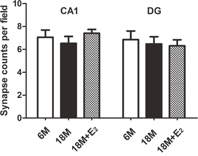 Figure 5: Synapse density in the hippocampus of mice. In hippocampal CA1 and DG subfields, the synapse number per field has no statistical difference among 6 M, 18 M and 18 M + E2 groups. (n = 22, one-way ANOVA). Data are presented as mean ± SEM.