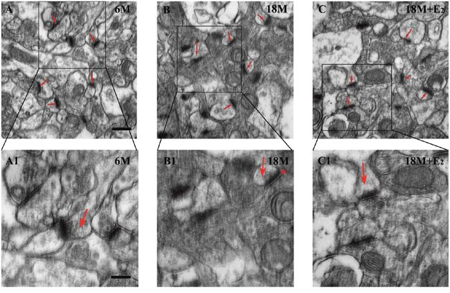 Figure 6: Estrogen had no effect on the morphology of synapse in postmenopause mice. A. Typical synapse including presynaptic and postsynaptic regions as well as synaptic cleft was observed in hippocampal CA1 neuron of 6 M mice; A1. Presynaptic vesicles were detected in the regional magnified version. B. In 18 M group, synapses were also prominent in morphology; B1. The synaptic cleft was clearly recognized and marked by an asterisk. C. The morphological appearance of synapse in 18 M + E2 mice was comparative with the other two groups; C1. Active zone thickness, synaptic cleft width and the amount of presynaptic vesicles were similar to the other groups. Active zone of synapse is arrowed in A-C. Arrows in A1-C1 point to the presynaptic region. Scale bar = 500 nm in A-C and 250 nm in A1-C1.