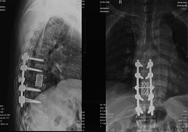 The most common complaints included nocturnal back pain, extremity numbness and paraplegia. The mean preoperative Visual Analogue Scale (VAS) was 7.32 (median7.11, range 1-10), and Frankel score ranged from A to D. No patient died during the perioperative period. The mean postoperative VAS was 4.12 (median 4.08, range 1-7). The postoperative Frankel score ranged from C to E. Eleven (7.10%) patients had delayed wound healing. All healed after strengthening antibiotics, nutritional support (nine cases) and wound debridements (two cases).