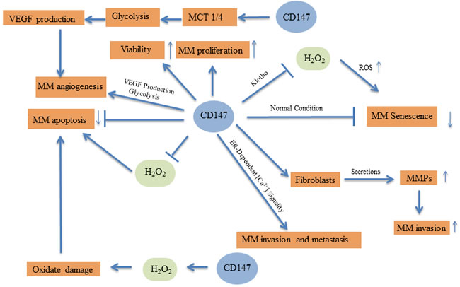 It has been well established that CD147 plays critical roles in mediating cell proliferation, apoptosis, and oxidative stress. Miho Hatanaka found melanoma cell growth was inhibited by CD147 silencing [59], Luo Z reported CD147 regulates mitochondrial apoptotic pathway in human malignant melanoma cells by interacting with NDUFS6 [22]. And blocking CD147 induces cell death in cancer cells through impairment of glycolytic energy metabolism [60].Depletion of CD147 sensitizes human malignant melanoma cells to hydrogen peroxide-induced oxidative stress [16]. H2O2 has been shown to induce senescence in normal human skin fibroblasts, in our group we investigated the molecular influences and mechanisms of CD147 on H2O2-induced cellular senescence. We showed that under normal conditions, shRNA-mediated CD147 silencing could inhibit cell proliferation, induce premature senescence, and induce senescence-related cell cycle arrest. While under oxidative stress conditions induced by H2O2, CD147 silencing exacerbated cellular senescence by increasing ROS accumulation and destroying the intrinsic antioxidant defenses. This process might be related to the klotho protein, a newly discovered anti-aging protein [16]. Since CD147 could promote the production and secretion of MMPs from skin fibroblasts, which is the major component of the microenvironment of MM [27], CD147 is potentially implicated in the development and progression of MM.
