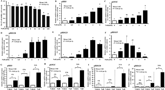 Furthermore, we examined the time-dependent effects on pBD3, pEP2C, pBD128, and pBD123 expression, which demonstrated a greater magnitude of induction among all genes. Our results revealed a remarkable time-dependent induction of pBD3 following treatment of the cells with 8 mM NaB at 6, 12, and 24 hours (Figure 1G). A clear time-dependent response to NaB was observed for pEP2C expression, in which a marginal up-regulation was observed at 6 hours but a dramatic difference was detected at 12 and 24 hours (Figure 1H). Similarly to pEP2C, pBD128 and pBD123 exhibited a significant increase at 6, 12, and 24 hours in a time-dependent manner (Figure 1I and 1J).