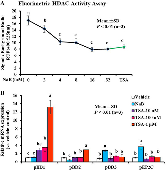 Figure 2: Modulation of histone acetylation activity and AMP gene expression in response to NaB or TSA. (A) HDAC activity was monitored by excitation at 490 nm and emission at 525 nm. (B) PK-15 cells were treated using various concentrations of TSA. Bars represent means with SD of three independent experiments; means with different letters are significantly different at P < 0.01.