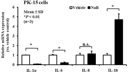 Figure 4: NaB controls inflammatory cytokine expression in PK-15 cells. qRT-PCR analysis of inflammatory cytokines, including IL-1α, IL-6, IL-8, and IL-18 mRNA expression, in PK-15 cells treated with 8 mM NaB. *P < 0.01; n.s., not significant at P < 0.01.