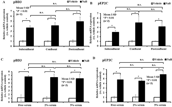 Figure 5: Effect of cell density or serum concentration on NaB governs the up-regulation of AMP expression. (A, B) qRT-PCR analysis of pBD3 and pEP2C transcription at different cell densities treated with 8 mM NaB. (C, D) qRT-PCR analysis of pBD3 and pEP2C transcription in cells cultured in different serum concentrations and treated with 8 mM NaB. *P < 0.01; n.s., not significant at P < 0.01. Data were analyzed using the unpaired Student’s t-test.