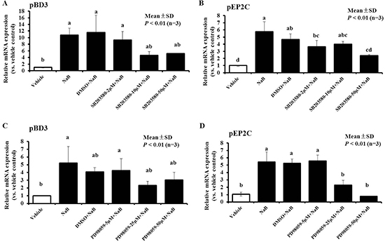 Figure 6: Effect of MAPK inhibitors on the up-regulation of NaB-mediated pBD3 and pEP2C expression. PK-15 cells were pretreated with a series of concentrations of the ERK1/2 inhibitor PD98059 or p38 MAPK inhibitor SB203580 and DMSO at a dose no less than the dose required to solve SB 203580 or PD98059 for 5 hours prior to incubation with 8 mM NaB. (A and C) PD98059; (B and D) SB203580. Bars represent means with SD of three independent experiments. Means with different letters are significantly different at P < 0.01.