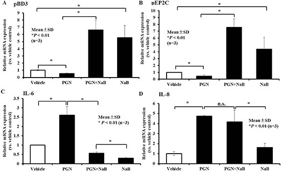 Figure 7: Effect of NaB on porcine kidney cells in the presence of the TLR2 ligand peptidoglycan. qRT-PCR to detect changes in gene transcription of (A) pBD3, (B) pEP2C, (C) IL-6, and (D) IL-8 in cells treated with 8 mM peptidoglycan and 250 ng/ml peptidoglycan for 24 hours. n.s., not significant at P < 0.01; *P < 0.01 (A and B). Data were evaluated using the unpaired Student’s t-test. “PGN” represent peptidoglycan.