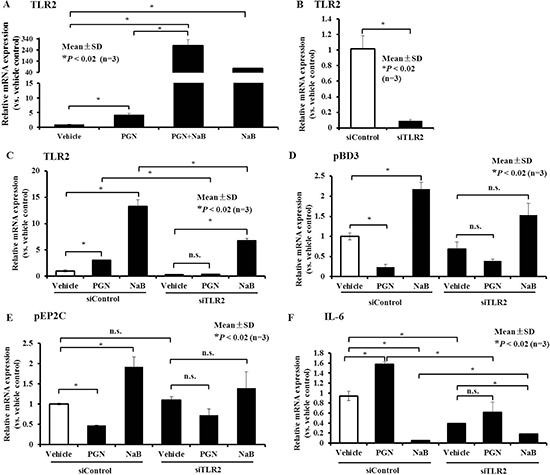 Figure 8: Role of TLR2 in AMP expression control by peptidoglycan and NaB in PK-15 cells. (A) qRT-PCR analysis of TLR2 expression in cells after treatment with 8 mM NaB or 250 μg/mL peptidoglycan or co-incubation with both for 24 hours. (B) PK-15 cells were transfected with siRNA targeting TLR2, and then qRT-PCR was performed to detect TLR2 gene expression. (C–F) PK-15 cells were transfected with siRNA against TLR2 or siControl, and 6 hours post-transfection, the culture medium was replaced with medium containing 250 μg/mL peptidoglycan or 8 mM NaB for 24 hours. qRT-PCR was then performed to detect TLR2 (C), pBD3 (D), pEP2C (E), and IL-6 (F) transcript levels. Asterisks (*) represent statistical significance at P < 0.02, n.s., not significant. “PGN” represent peptidoglycan.