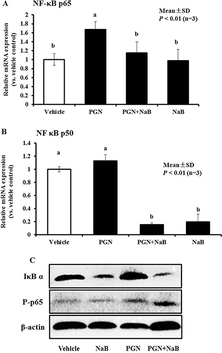 Figure 9: Effect of NaB (8 mM), peptidoglycan (250 μg/mL) or the combination of both on NF-κB signaling in PK-15 cells. (A, B) qRT-PCR was performed to detect p65 and p50 mRNA levels after treatment with peptidoglycan (250 μg/mL), NaB (8 mM), or the combination of both substances for 24 hours. Different letters (a, b, c, and d) indicate significant differences at P < 0.01 among the four groups. (C) Total proteins were harvested for western blot analysis to detect protein levels of IκB α and p65 phosphorylation in PK-15 cell treated as in (A and B). β-actin served as a loading control. “PGN” represent peptidoglycan.