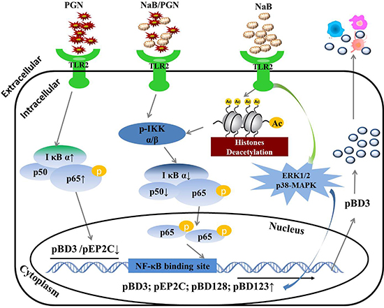 Figure 11: Regulatory mechanism of AMP gene expression induced by NaB in porcine kidney cells. NaB inhibited HDAC activity and improved AMP expression, even following challenge with the TLR2 ligand peptidoglycan. The mechanism: NaB leads to IκB α degradation, a reduction of p50 transcription and an increase in p65 phosphorylation, subsequently activating the NF-κB pathway and leading to enhanced AMP transcription via TLR2. The MAPK pathway also plays a role in the regulation of AMPs by NaB. NaB reversed the down-regulation of AMPs induced by the TLR2 ligand peptidoglycan by inhibiting the levels of p65 and decreasing p50 transcription and even IκB α degradation, which are key factors in the NF-κB pathway. Finally, overexpression of pBD3 protein regulated the expression of other cytokines in porcine kidney cells.