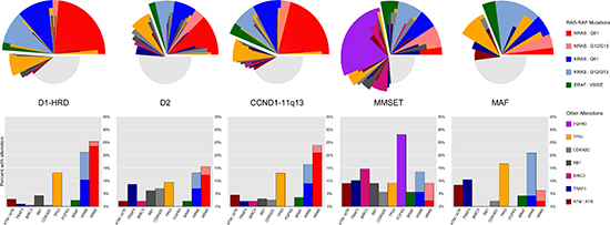 Figure 1: Distribution of RAS-RAF codon and other key alterations across TC-6 subgroups. NRAS mutations at Q61 are commonly seen in D1-HRD, D2, and CCND1-11q13 subgroups but rare among the MMSET and MAF subtypes. FGFR3 mutations are exclusive to the MMSET subtype and other genes are altered at a higher frequency in particular subgroups, e.g. MMSET cases are enriched for BIRC3 alterations and CCND2 expressing subgroups (D2, MMSET, and MAF) are enriched for TRAF3 alterations. Stacked bar plots represent frequencies of key alterations reported as percentages within each TC-6 subgroup. For the small number of cases (1.1%) with co-occurrence of RAS-RAF mutations, only the mutation with highest variant allele frequency (VAF) was used. For the radial alteration plots, each individual slice corresponds to the mutational profile of one specific subject.