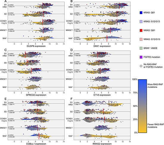 Figure 2: Differential gene expression patterns associated with presence of RAS-RAF mutations across TC-6 subgroups. The gene expression levels of DUSP6, DKK1, SPRED2, ETV5, and COBLL1 were highly associated with the presence of RAS-RAF or FGFR3 mutations across all cases (A–E). COBLL1 expression is negatively associated with presence of RAS-RAF mutation while remaining genes are positively associated. The RAS viral oncogene, RRAS2, has a dichotomous expression pattern in the D1-HRD subgroup where high expressers of RRAS2 have few RAS-RAF mutations (F). Density curves are colored according to localized rate of RAS-RAF/FGFR3 mutation and represent probability distributions for mutated and non-mutated cases, separated by dividing horizontal lines. Vertical red lines indicate optimal thresholds of significance according to Fisher exact tests, limited to interior 60% of percentiles, where only highly significant p-values were reported (< 0.005). CCND3-6p21 subgroup not included due to sample size restraints (n =10). Gene expression represents log2 of GCRMA normalized data using the following probe or average of probes: DUSP6 – 208891_at, 208892_s_at, 208893_s_at; DKK1 – 204602_at; SPRED2 – 212458_at; ETV5 – 203349_s_at; COBLL1 – 203641_s_at, 203642_s_at; and RRAS2 – 212589_at, 212590_at.