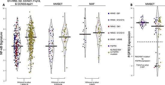 Figure 3: NFκB signature across TC-6 subgroups and FGFR3 expression in MMSET subgroup. The 11-gene NFκB signature is significantly associated with presence of RAS-RAF or FGFR3 mutations in all TC-6 subgroups excluding MAF where cases without RAS-RAF mutations have higher levels of NFκB activation (A). When examining interaction of FGFR3 expression and RAS-RAF mutation in MMSET, we observed that 56% (10/18) cases with low FGFR3 expression have RAS-RAF mutations compared to 21% of remaining cases (15/71) (B).