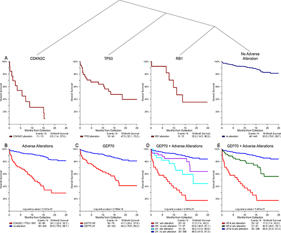 Figure 4: Alterations of TP53, CDKN2C, and RB1 showed significant association with overall survival in non-relapse clinical setting. Conditional inference tree analysis of all possible DNA alterations against outcome revealed that alterations in TP53, CDKN2C, and RB1 were significantly associated with an adverse outcome for all cases with disease stages prior to relapse (A). The subset of cases with one or more of these adverse alterations had an 18-month OS rate that was statistically similar to that of GEP70 HR cases (B, C). Combining GEP70 risk and the presence of adverse alterations identified three cohorts with distinct clinical course: poor, intermediate, and standard outcomes (D, E).