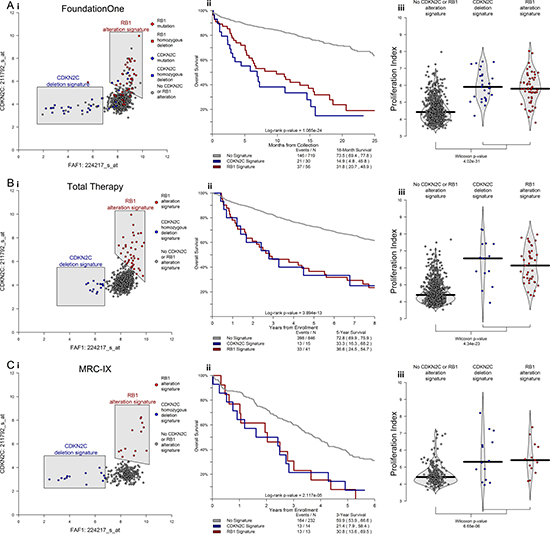 Figure 5: CDKN2C and RB1 alterations elicit distinct patterns of gene expression that have significant impact on proliferation and clinical outcome in newly diagnosed MM. Differential expression analysis revealed highly significant patterns of expression associated with alteration in CDKN2C and RB1. Namely that cases with deletion of CDKN2C have lower expression of FAF1 and that cases with alterations of RB1 have higher expression of CDKN2C (Ai). Cases with either of these distinct expression patterns had inferior outcomes (Aii) and higher 50-gene proliferation scores (Aiii). Identical patterns of inferior outcome and elevated proliferation were observed in both the Total Therapy and MRC-IX data sets of NDMM (B, C). In total, alterations in CDKN2C and RB1 offer mutually exclusive paths that culminate in similar high-risk behavior.