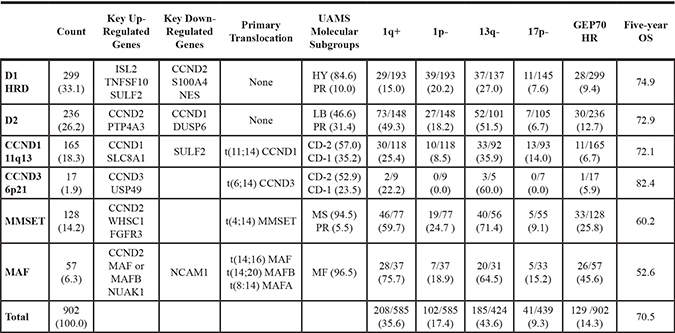 Subgroups with over-expression of CCND2 (D2, MMSET, and MAF) had higher rates of 1q+ and 13q-. MAF and MMSET cases have the highest proportions of GEP70 HR and the poorest outcome.
