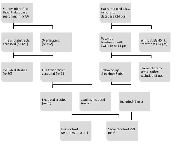 Advanced stage (IIIB/IV) LSCC patients with EGFR mutations treated with EGFR-TKIs were identified in the database of Shanghai Chest Hospital from July 2014 to August 2016, or extracted from the publications searched from the online medicine databases.