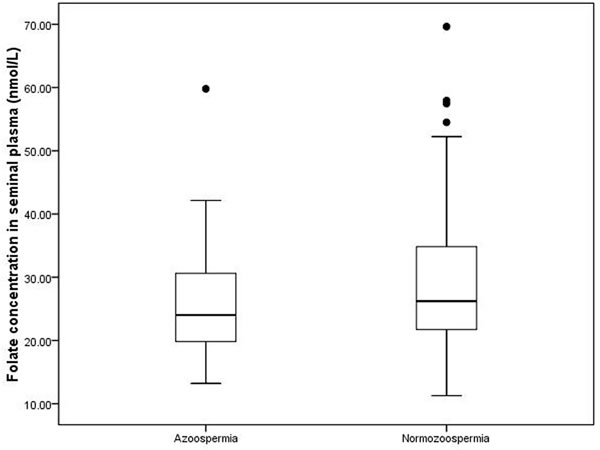 Figure 1: Distribution of folate level in seminal plasma in two groups. Box plots of seminal plasma folate concentrations in the 269 study subjects. In each plot, the solid horizontal lines mark the 10th, 25th, 50th, 75th and 90th percentile points of the data. The box encompasses the 25th through the 75th percentiles.