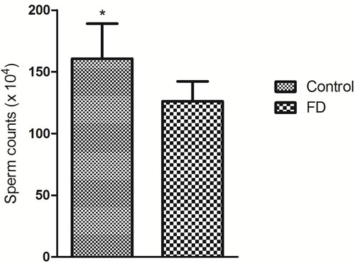Figure 2: Effect of folate deficiency on sperm counts in mice. Means ± SD of determinations (each group, n = 6) are shown. *P < 0.05 by Student’s t-test.