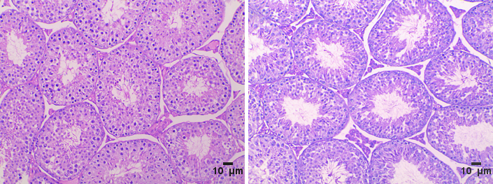 Epididymal sperm count was determined as previously described [46]. Epididymis was collected from each group at the end of the 8th week and homogenized in 1 mL of saline. The homogenized samples were incubated at 37 °C under 5% CO2 saturated humidity for 30 min. Spermatozoa in 10 μL of the well-mixed sample were counted in the 25 squares of the chamber for four times. The testis samples were fixed, dehydrated, and embedded in paraffin. The tissue sections were cut into a thickness of 5 µm by using a Leica microtome and subjected to hematoxylin and eosin (HE) staining. After the slides were obtained, histopathological examination was performed and analyzed using the free software Image J.